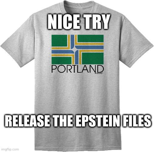 Portland Oregon flag tee captioned 'nice try. Release the Epstein files'