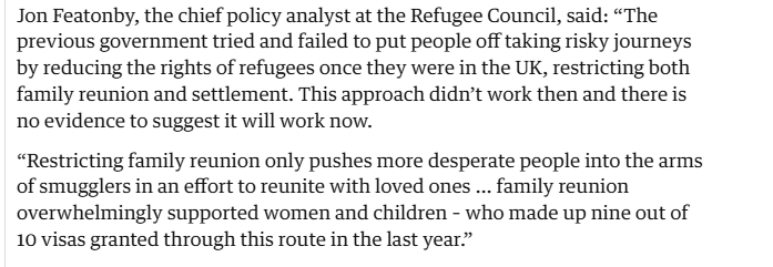 Jon Featonby, the chief policy analyst at the Refugee Council, said: “The previous government tried and failed to put people off taking risky journeys by reducing the rights of refugees once they were in the UK, restricting both family reunion and settlement. This approach didn’t work then and there is no evidence to suggest it will work now. “Restricting family reunion only pushes more desperate people into the arms of smugglers in an effort to reunite with loved ones .. family reunion overwhelmingly supported women and children - who made up nine out of 10 visas granted through this route in the last year.”