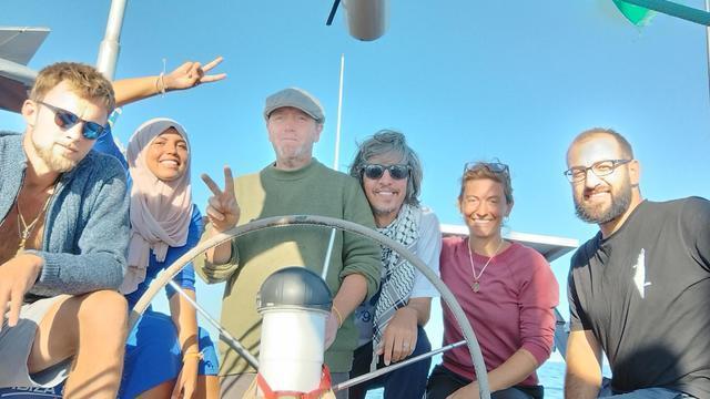 Six free people of the global sumud flotilla, gathered around the wheel of the Mikeno.